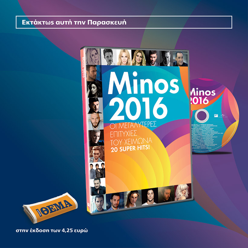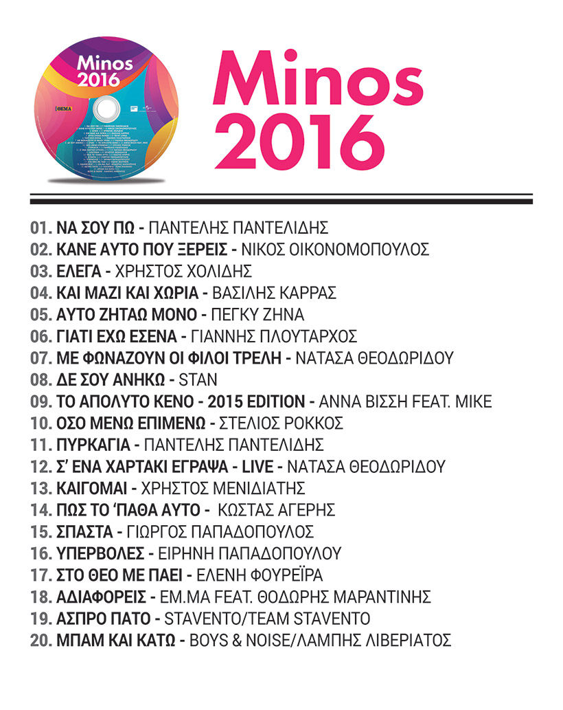 Αποκτήστε λοιπόν εκτάκτως τα Χριστούγεννα τη συλλογή Minos 2016 με τα 20 super hits του φετινού χειμώνα!