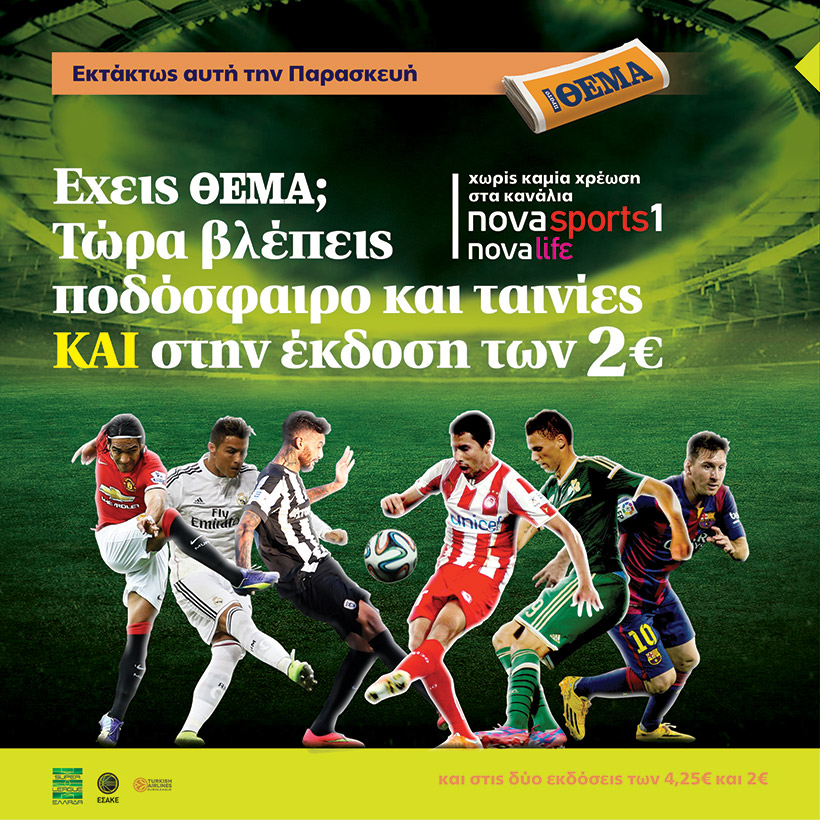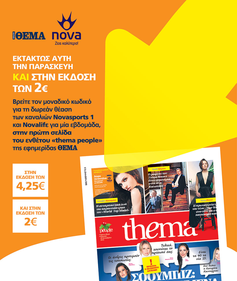 Η συνεργασία δίνει την δυνατότητα στο «ΘΕΜΑ» να παρέχει στους αναγνώστες του το προνόμιο να απολαμβάνουν ολόκληρη την εβδομάδα (και κάθε εβδομάδα) χωρίς όριο και προϋποθέσεις εντελώς δωρεάν και αγοράζοντας είτε την απλή έκδοση είτε την έκδοση με τις προσφορές δύο από τα πιο δημοφιλή κανάλια, το Novasports1 στα αθλητικά και το Novalife στη διασκέδαση και την ψυχαγωγία.