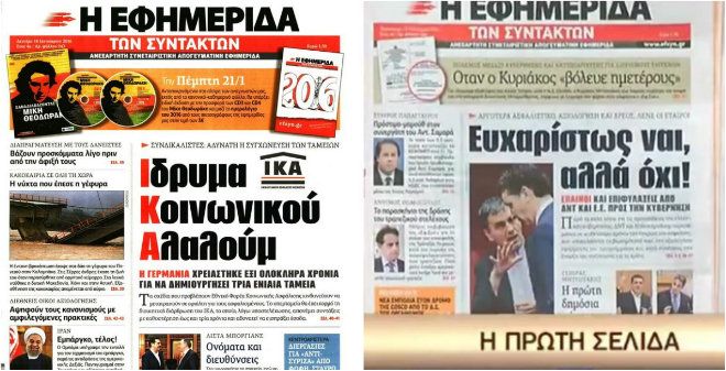 Το πρωτοσέλιδο της Δευτέρας της «Εφημερίδας των Συντακτών» στα αριστερά της φωτογραφίας. Στα δεξιά, το πρωτοσέλιδο της Παρασκευής που διαβάστηκε σαν πρωτοσέλιδο της Δευτέρας. Το ίδιο έγινε και με την «Καθημερινή».
