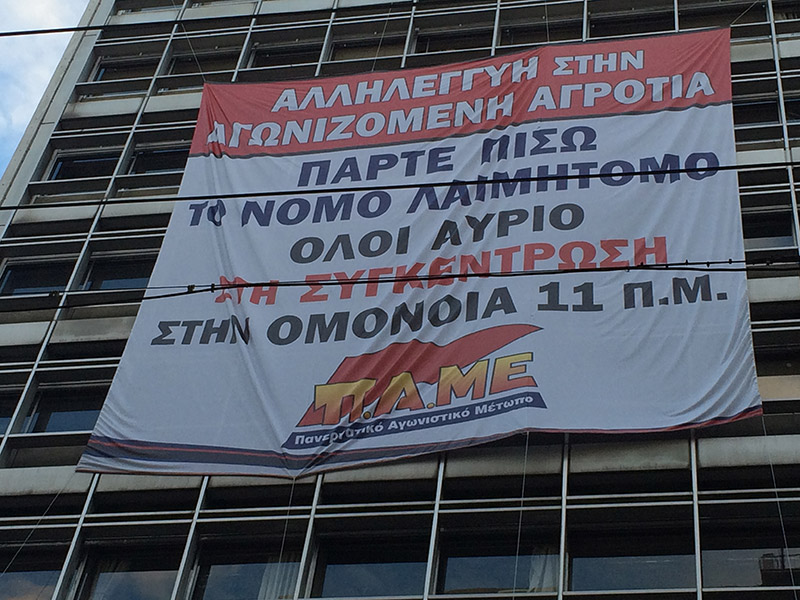 Οι συγκεντρωμένοι κρέμασαν ένα μεγάλο πανό στην πρόσοψη του κτιρίου και εκφράζουν την αλληλεγγύη τους στις κινητοποιήσεις των αγροτών. Καλούν μάλιστα τον κόσμο να ενισχύσει τα μπλόκα τους σε όλη τη χώρα.