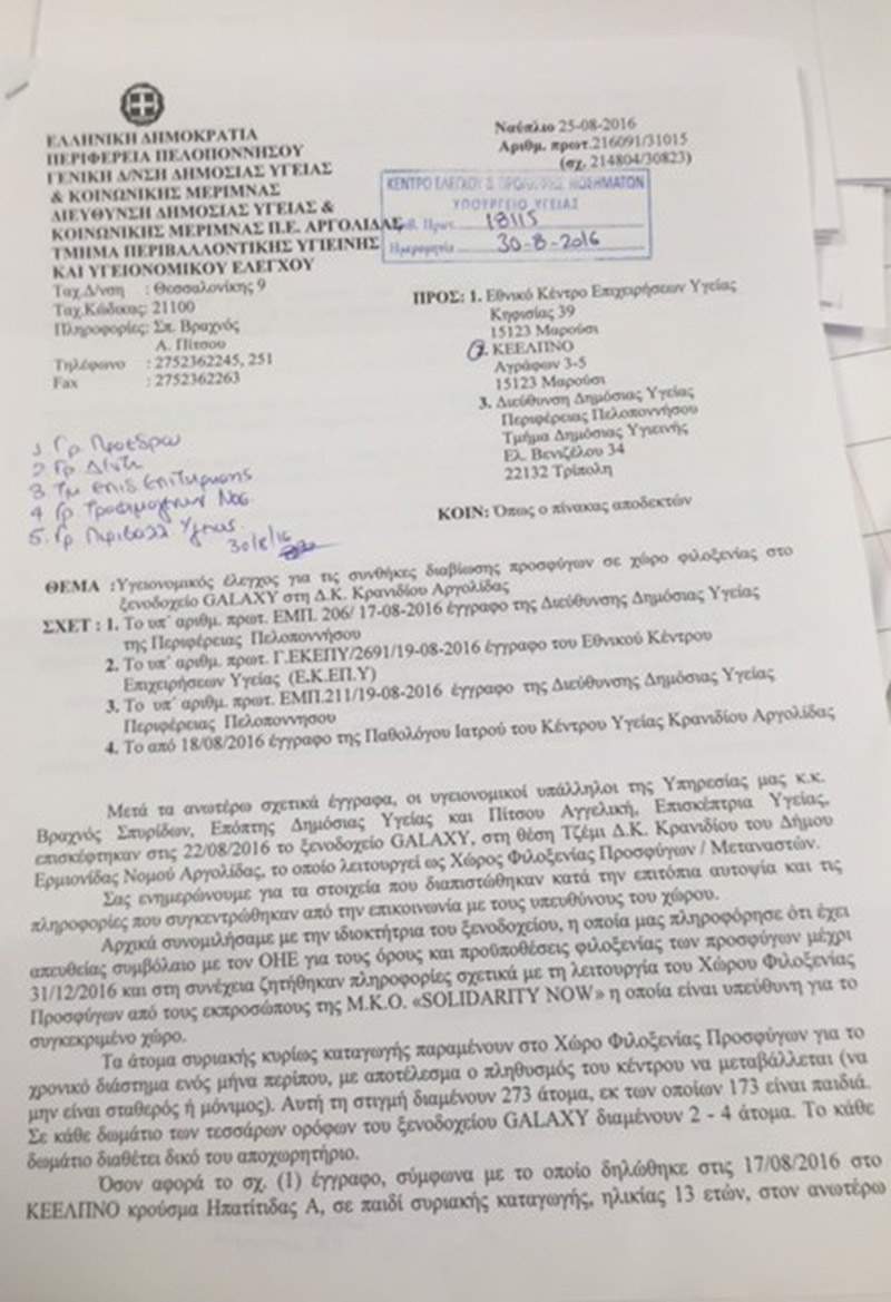Συγκεκριμένα, έκθεση της Διεύθυνσης Δημόσιας Υγείας της Περιφέρειας Πελοποννήσου σχετικά με κρούσμα ηπατίτιδας Α σε Κέντρο Φιλοξενίας (ξενοδοχείο) στο Δήμο Ερμιονίδας του Νομού Αργολίδας, περιγράφει τον υγειονομικό χειρισμό του περιστατικού που έγινε αποκλειστικά από την ΜΚΟ και τους ανθρώπους της. Ειδικότερα στην έκθεση αναφέρεται χαρακτηριστικά: "Η ΜΚΟ Solidarity Now είναι υπεύθυνη για την δωρεάν παροχή φαρμάκων καθώς και για τη διενέργεια εργαστηριακών εξετάσεων σε ιδιωτικά ιατρεία. Όταν κάποιο περιστατικό χρήζει περαιτέρω ιατρικής φροντίδας ή νοσηλείας ή είναι λοιμώδες μεταφέρεται με ευθύνη της ΜΚΟ σε σπίτι του Δήμου Αθηναίων".