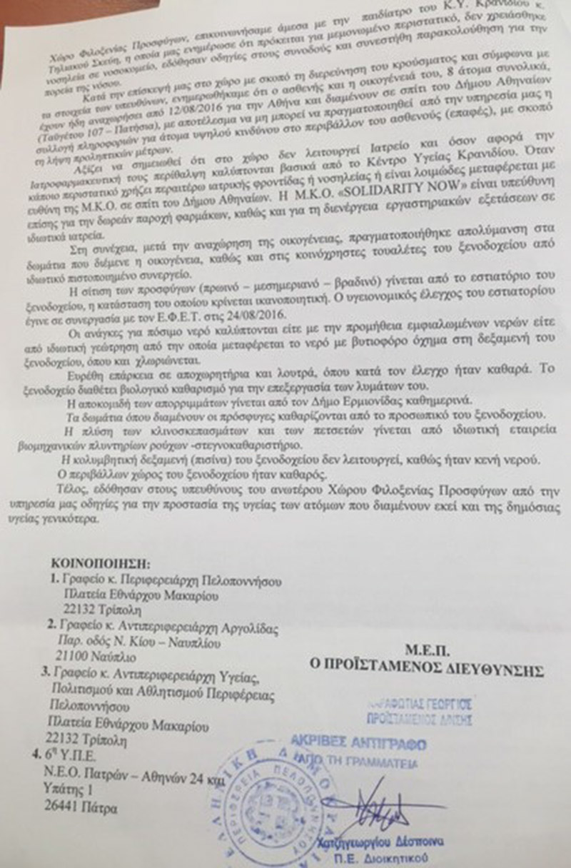 «Αγαπητοί συνεργάτες θέλουμε να αναφέρουμε την ανησυχία μας που εντοπίζεται σε μια βασική έλλειψη αναφορικά με την παροχή ιατρικών υπηρεσιών από τους φορείς σας μέσα στους χώρους των Ανοιχτών Δομών Φιλοξενίας Προσφύγων και Μεταναστών…καθώς διαπιστώνουμε ότι δεν υπάρχει πρόβλεψη για τη διαχείριση περιστατικών τα οποία πάσχουν ή από κάποιο σοβαρό ή από κάποιο έκτακτο πρόβλημα υγείας και πρέπει να διαμετακομισθούν ή να διασυνδεθούν με το αντίστοιχο νοσοκομείο του ΕΣΥ»