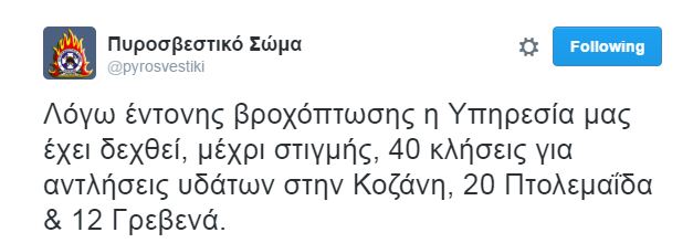 Η πυροσβεστική στην Δυτική Μακεδονία δέχτηκε το τελευταίο 24ωρο, 40 κλήσεις για αντλήσεις υδάτων στην Κοζάνη, 20 Πτολεμαΐδα και 12 Γρεβενά.