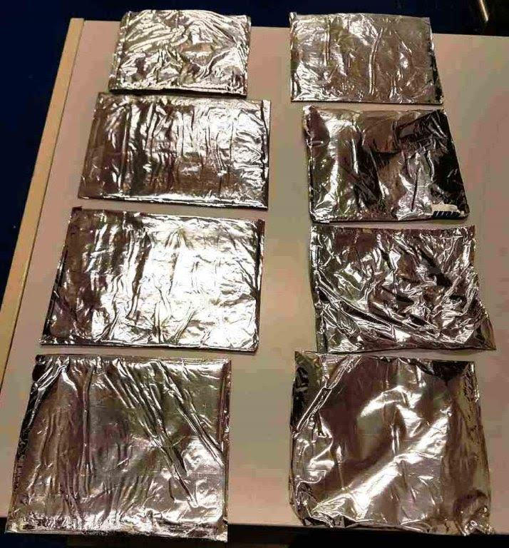 Συνολικά οι αστυνομικοί ανακάλυψαν οχτώ συσκευασίες συνολικού βάρους 2,435 κιλών τις οποίες ο Λιθουνός είχε βάλει σε δύο βιβλία και δύο ντοσιέ.