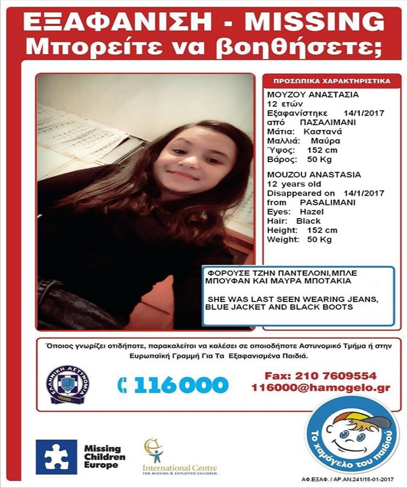 Όπως αναφέρει χαρακτηριστικά το Χαμόγελο του Παιδιού με δημοσίευσή του στο Facebook: «Στις 14/01/2017 στις 19:30 το απόγευμα, εξαφανίστηκε από την περιοχή Πασαλιμάνι, η Μούζου Αναστασία 11 ετών. Η Αναστασία έχει καστανά μάτια και μαύρα μαλλιά. Έχει ύψος 1,52 μ και βάρος 50 κιλά. Φορούσε τζην παντελόνι, μπλε μπουφάν και μαύρα μποτάκια. Οποιοσδήποτε έχει κάποια πληροφορία, παρακαλούμε να επικοινωνήσει τηλεφωνικά με τον Οργανισμό μας Το Χαμόγελο του Παιδιού όλο το εικοσιτετράωρο (24 ώρες), στην Ευρωπαϊκή Γραμμή Για τις Εξαφανίσεις 116.000 καθώς και σε όλα τα Αστυνομικά Τμήματα της χώρας».