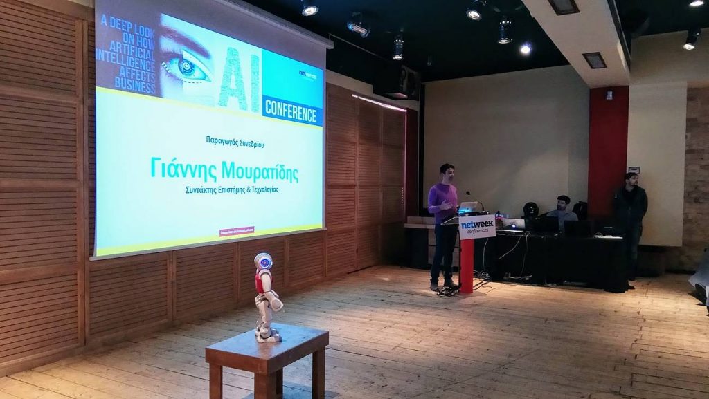 Παρακολουθήστε στο εκπληκτικό βίντεο τον Ερμή, ο οποίος απευθύνει χαιρετισμό στο κοινό του Συνεδρίου Artificial Intelligence που πραγματοποιήθηκε στο GazArte, στην Αθήνα στις 21 Μαρτίου 2017.