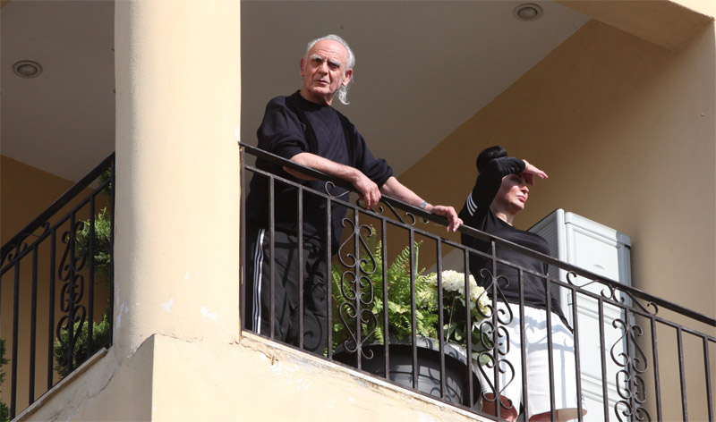 Ο Άκης Τσοχατζόπουλος με τη Βίκυ Σταμάτη στο μπαλκόνι κοιτούν προς το σχολείο του παιδιού τους