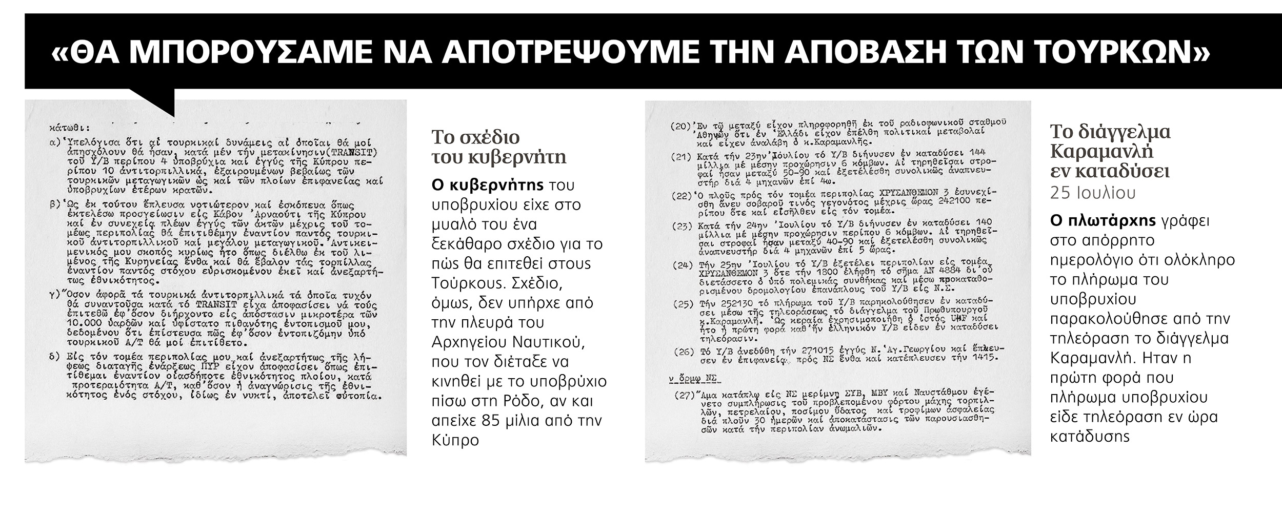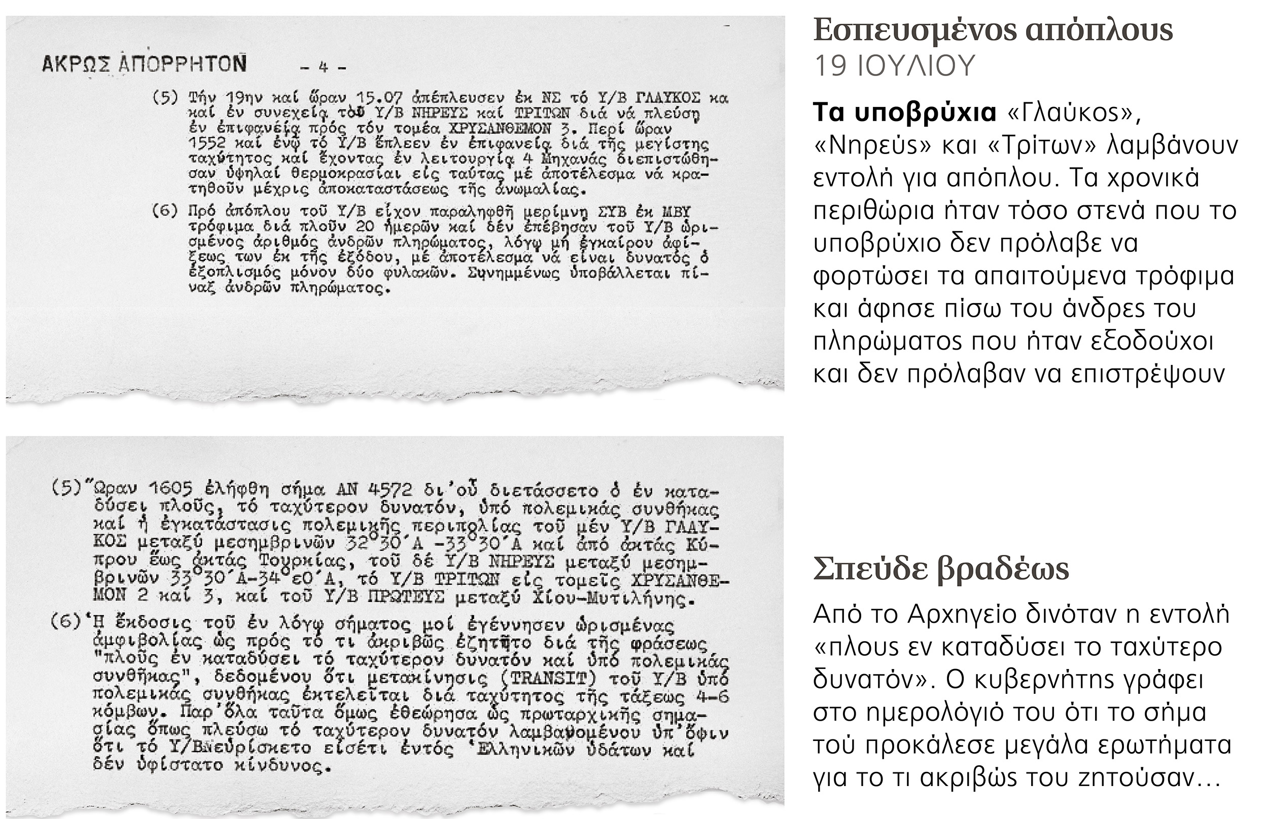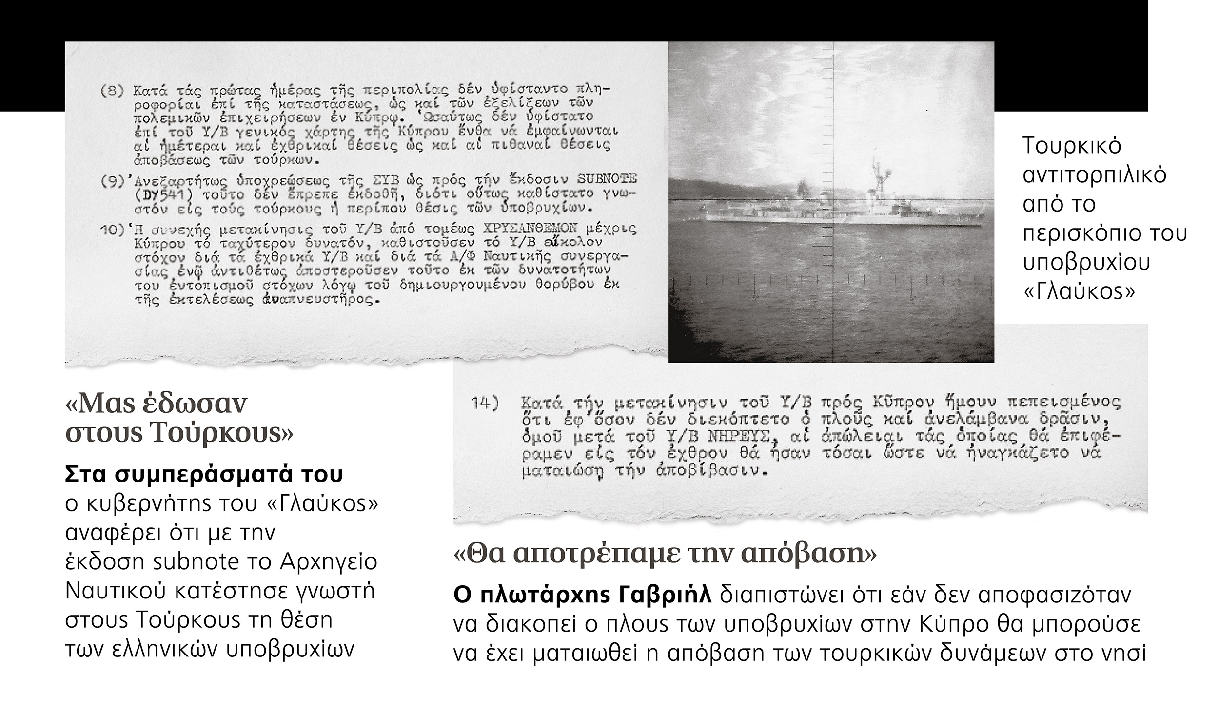 Η κυβέρνηση Καραμανλή αποφάσισε να στείλει στην Κύπρο τα υποβρύχια «Τρίτων» και «Πρωτεύς». Το σήμα ΑΝ140600/8 δόθηκε στις 14 Αυγούστου στις 5 το πρωί. Τα υποβρύχια ξεκίνησαν και όταν στις 9.50 το βράδυ έπλεαν προς την Κύπρο πήραν νέο σήμα (ΑΝ5931) να επιστρέψουν και πάλι. Ηταν η τρίτη φορά που η Ελλάδα αποφάσιζε να εμπλακεί με ναυτικές δυνάμεις στις πολεμικές επιχειρήσεις στην Κύπρο και για τρίτη φορά δίσταζε. Ο κυβερνήτης του υποβρυχίου «Γλαύκος» στην άκρως απόρρητη έκθεσή του εξέφραζε την πεποίθηση ότι αν είχαν αφεθεί τα υποβρύχια να χτυπήσουν τον τουρκικό στόλο θα ανέτρεπαν τα σχέδια της Τουρκίας. Γράφει λοιπόν ο πλωτάρχης Γαβριήλ: «Κατά την μετακίνησιν του Υποβρυχίου προς Κύπρον, ήμουν πεπεισμένος ότι εφ' όσον δεν διεκόπτετο ο πλους και ανελάμβανα δράσιν ομού μετά του υποβρυχίου “Νηρεύς”, αι απώλειαι τας οποίας θα επιφέραμεν εις τον εχθρόν θα ήσαν τόσαι ώστε να ηναγκάζετο να ματαιώση την αποβίβασιν».