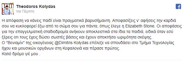 Στην ανάρτηση του στο Facebook o Θοδωρής Κολυδάς έγραψε:«Η απόφαση να κάνεις παιδί είναι πραγματικά βαρυσήμαντη. Αποφασίζεις ν’ αφήσεις την καρδιά σου να κυκλοφορεί έξω από το σώμα σου για πάντα, όπως έλεγε η Elizabeth Stone. Οι αποφάσεις για την επαγγελματική σταδιοδρομία ανήκουν αποκλειστικά στα ίδια τα παιδιά, ειδικά όταν εσύ ξέρεις οτι τους έχεις δώσει σωστές βάσεις και έχουν αποκτήσει ωριμότητα σκέψης. O "Βενιαμίν" της οικογένειας @Dimitris Kolydas επέλεξε να σπουδάσει στο Τμήμα Τεχνολογίας ήχου και μουσικών οργάνων στη Κεφαλονιά και πέρασε πρώτος. Καλό δρόμο γιέ μου».
