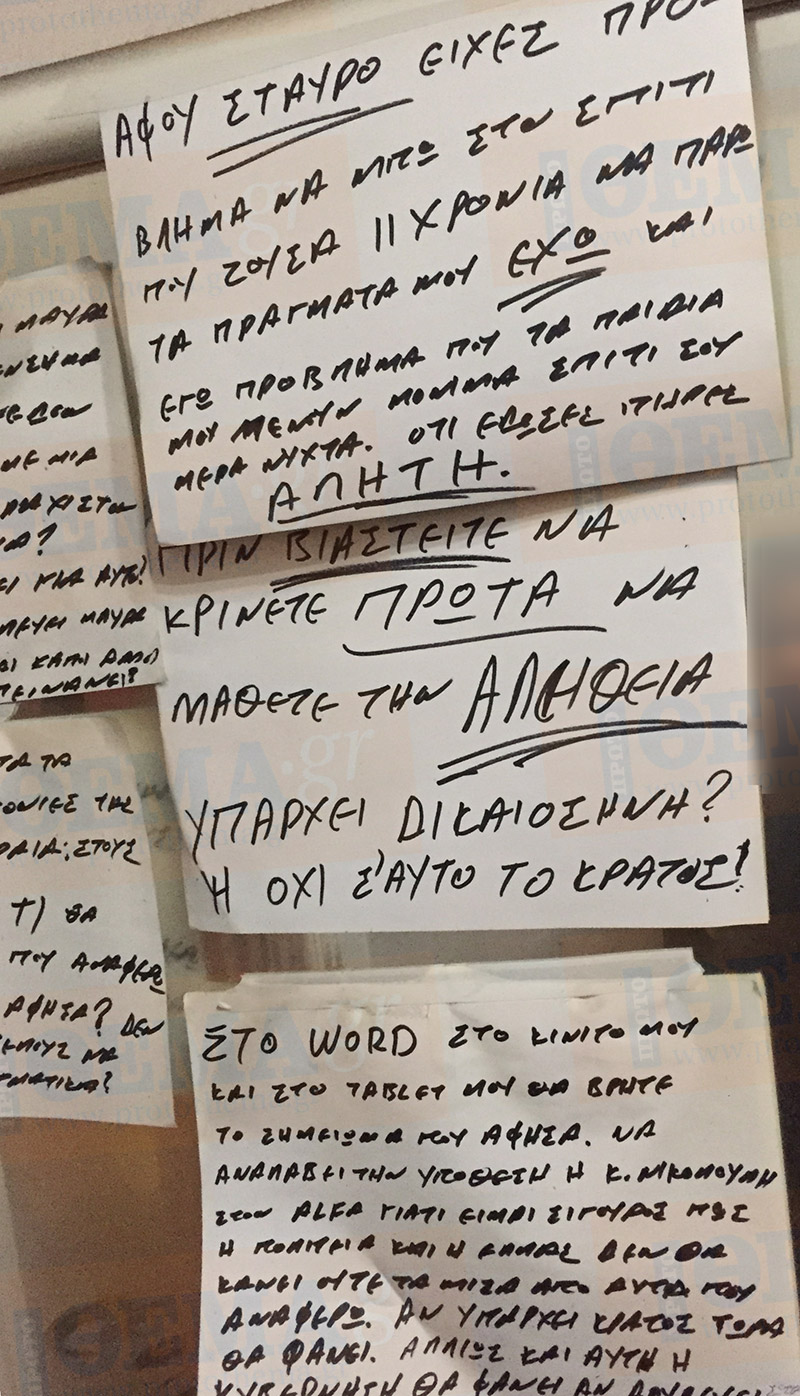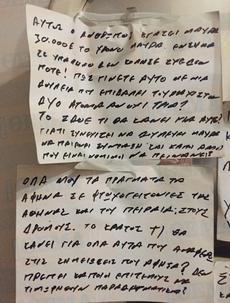 Όλα μου τα πράγματα, τα άφησα σε φτωχογειτονιές της Αθήνας και του Πειραιά. Στους δρόμους. Το Κράτος τι θα κάνει για όλα αυτά που αναφέρω; Στις σημειώσεις που άφησα; Δεν πρέπει κάποιοι επιτέλους να τιμωρηθούν παραδειγματικά;», έγραφε σε χαρτιά που βρέθηκαν κρεμασμένα στους τοίχους.
