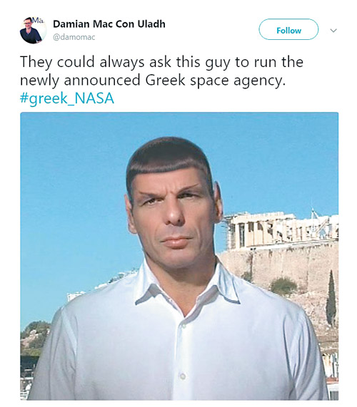 «Οι δικοί μας αστροναύτες θα πατήσουν πάνω στο χρέος και θα φτάσουν στο υπερπέραν», «Η Φλωρεντία βγάζει εκθέσεις για δορυφόρους ή θα πρέπει να βρούμε άλλο ίδρυμα;», «Η Ελλάδα του ΣΥΡΙΖΑ... είναι η χώρα των UFO», «Η ανάπτυξη έχει φτάσει ως το υπερπέραν» κ.λπ. Η «Greek NASA» δεν γεννήθηκε απλώς, δημιουργήθηκε για να προσφέρει διέξοδο στο τρολάρισμα. Από την πρώτη στιγμή της ανακοίνωσης ότι η πατρίδα μας διεκδικεί πλέον τη θέση που της αξίζει στην επιχείρηση κατάκτησης του Διαστήματος τα social media ετέθησαν σε κατάσταση κόκκινου συναγερμού. Ωστόσο, ο ενθουσιασμός για τη θέσπιση της Εθνικής Διαστημικής Νομοθεσίας είναι γνήσιος και κυρίαρχος.