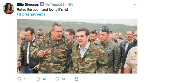 Ενα από τα πιο φαντασμαγορικά, τρικούβερτα πάρτυ στο Twitter ξεκίνησε από την ήδη μνημειώδη φράση του Αλέξη Τσίπρα «We have already eaten the camel, we now have the queue»! Αποδεικνύοντας ότι λειτουργεί ως διευθυντής ορχήστρας και δίνει τον τόνο στην κοινή γνώμη, ο πρωθυπουργός απέδωσε εις την αγγλικήν την πασίγνωστη παροιμία με τον γάιδαρο και την ουρά. Μιλώντας σε ένα παγκόσμιο κοινό, με τη χαρακτηριστική του άνεση, ο κ. Τσίπρας αντικατέστησε το ένα ζώο με ένα άλλο, δίνοντας μια αίσθηση παγκοσμιότητας στον λόγο του. Και αντί της ταπεινής ουράς του ιπποειδούς, παρέπεμψε στη σειρά αναμονής. Το δε hashtag #tsipras_proverbs γέμισε εν ριπή οφθαλμού με αμέτρητες παροιμίες σε αυτοσχέδια, κακοτράχαλα greeklish.