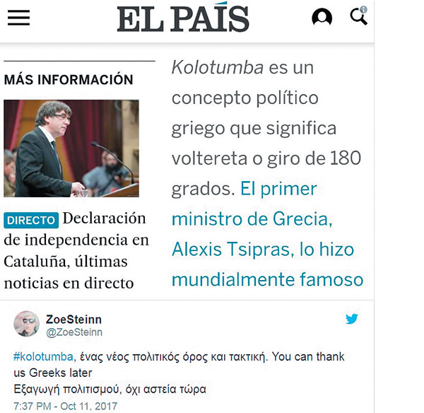 Με ισπανική εισήγηση καταχωρίστηκε στα διεθνή λεξικά πολιτικής ορολογίας η ελληνική «kolotumba». Η μεγάλη αυτή τιμή που περιποίησαν οι Ιβηρες αδελφοί στη συνέπεια και την αξιοπιστία μας προέκυψε τον Οκτώβριο του ’17 εξ αφορμής της απόπειρας αυτονόμησης της Καταλονίας. Βάσει των κοινών στοιχείων με την Ελλάδα του 2015, η «El Pais» διέγνωσε ότι υπήρξε η ίδια «στροφή 180 μοιρών», όπως και στο σκίσιμο των μνημονίων από τον Αλέξη Τσίπρα. Επομένως, ο πλέον ενδεδειγμένος όρος για να αποδώσει την αναστροφή των Καταλανών ήταν η kolotumba. Υπερήφανοι που και πάλι δώσαμε τα φώτα μας στους Ευρωπαίους, οι Ελληνες χρήστες του Twitter τίμησαν την καταξίωση με σχόλια όπως «Μπράβο μας. Κάποτε υπερηφανευόμασταν για τη λέξη φιλότιμο που δεν την έχει κανένας άλλος λαός. Τώρα τους μάθαμε και τον όρο #kolotumba» κ.λπ.