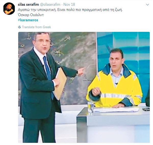 «Δεν πάμε στα κανάλια, “κρυβόμαστε” λένε, πάμε στα κανάλια απευθείας από τα ρέματα και τις πλημμύρες για 10 λεπτά και μας κρίνουν για το dress code. Δεν βγάζεις άκρη», ήταν ο καημός του αντιπεριφερειάρχη, όπως τον κατέθεσε στο Twitter. Θα πρέπει κανείς να δείξει συμπόνια στα υπαρξιακά αδιέξοδα του Γιώργου Καραμέρου, ιδιαίτερα ύστερα από το γλέντι που ακολούθησε την εμφάνισή του σε πρωινή εκπομπή με τη φλούο κίτρινη νιτσεράδα. Το μήνυμα που ήθελε να μεταδώσει ήταν «δεν προλαβαίνω ούτε το φωσφοριζέ τζάκετ να βγάλω». Ομως οι επικρίσεις περί υποκριτικού υπερβάλλοντος ζήλου πλημμύρισαν το Twitter πιο γρήγορα και από τα ρέματα της Μάνδρας.