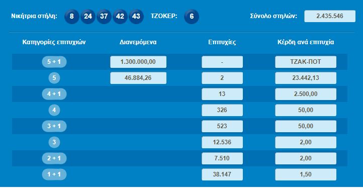 Οι αριθμοί που κληρώθηκαν είναι οι εξής: 8, 24, 37, 42 και 43. Τζόκερ βγήκε ο αριθμός 6.