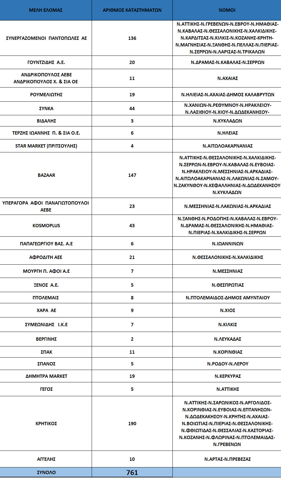 Οι αλυσίδες super market που είναι μέλη της ΕΛΟΜΑΣ και άρα συμμετέχουν στην μεγάλη προσφορά του ΘΕΜΑτος είναι οι εξής: