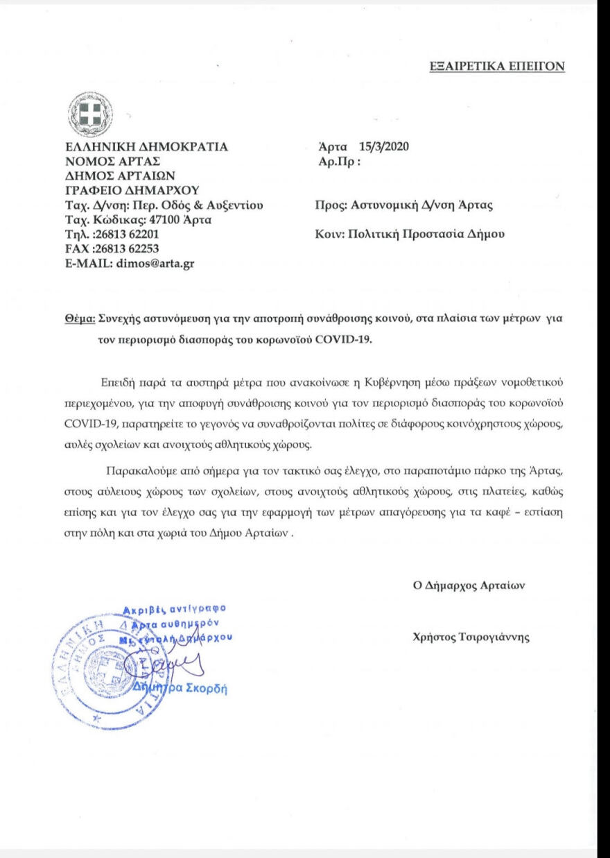 Συγκεκριμένα, αναφέρει στο έγγραφο αίτημα του: Επειδή παρά τα αυστηρά μέτρα που ανακοίνωσε η κυβέρνηση μέσω πράξεων νομοθετικού περιεχομένου, για την αποφυγή συνάθροισης κοινού για τον περιορισμό διασποράς του κορωνοϊού, παρατηρείται το γεγονός ότι συναθροίζονται πολίτες σε διάφορους κοινόχρηστους χώρους, αυλές σχολείων και ανοιχτούς αθλητικούς χώρους. Παρακαλούμε από σήμερα για τον τακτικό σας έλεγχο, στο παραποτάμιο πάρκο της Άρτας, στις αυλές των σχολείων, στους ανοιχτούς αθλητικούς χώρους, στις πλατείες, καθώς επισης και για τον έλεγχο σας γι την εφαρμογή των μέτρων απαγόρευσης για τα καφέ- εστίαση στην πόλη και στα χωριά του Δήμου Αρταίων». Το αίτημα του δημάρχου ικανοποιήθηκε άμεσα και έτσι αστυνομικές δυνάμεις βγήκαν σε περιπολία και εκκένωσαν δημόσιους χώρους αναψυχής και άθλησης ζητώντας από το κόσμο, μικρούς και μεγάλους να αποχωρήσουν άμεσα όπως μπορείτε να δείτε και στις φωτογραφίες που εξασφάλισε το protothema.gr.