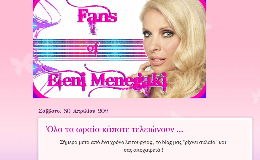 Το fanselenimenegaki, το μόνο blog που η Ελένη Μενεγάκη έχει αναγνωρίσει μέσα από την εκπομπή της και έχει ευχαριστήσει τους διαχειριστές του ουκ ολίγες φορές για τη βοήθεια τους, έριξε αυλαία και έτσι από χθες Σάββατο η «βασίλισσα της πρωινής ζώνης» έχει μια αρκετά σημαντική για την ίδια απώλεια.