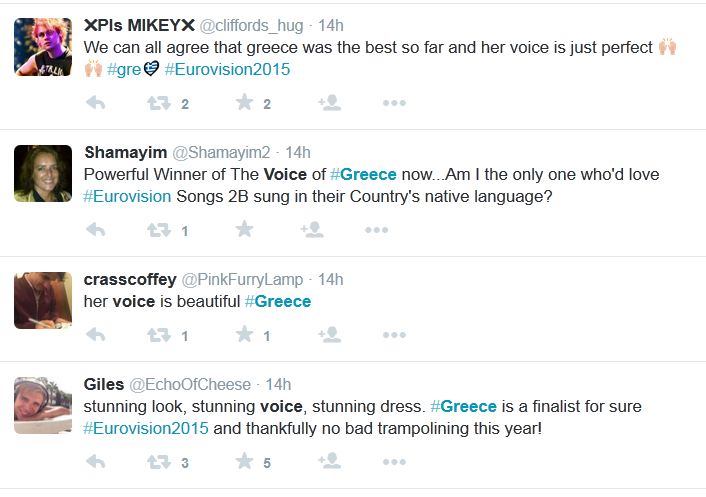 Κατά γενική ομολογία, η παρουσία της και η ερμηνεία της στη σκηνή ήταν άρτια και κατάφερε να κερδίσει τις εντυπώσεις. Όπως συνηθίζεται, σε τέτοιου είδους τηλεοπτικές διοργανώσεις, τα social media και κυρίως το twitter, πήραν «φωτιά». Ας δούμε πώς σχολίασαν την ελληνική συμμετοχή οι Ευρωπαίοι τηλεθεατές.
