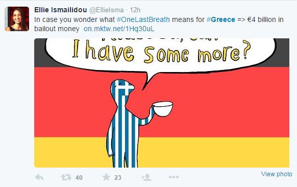 «Σε περίπτωση που αναρωτιέστε τι σημαίνει One Last Breath για την Ελλάδα = 4 δις. για το πρόγραμμα διάσωσης της χώρας»