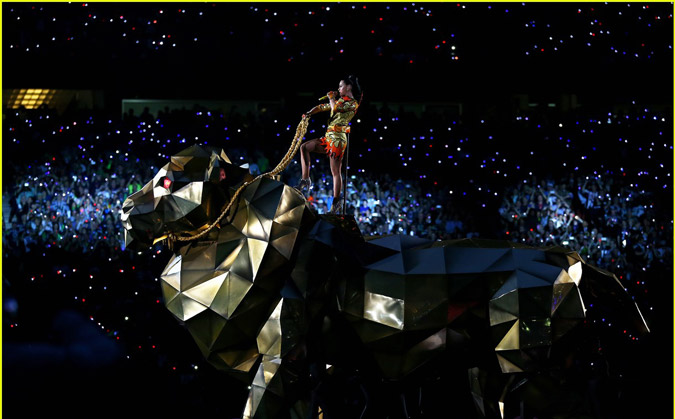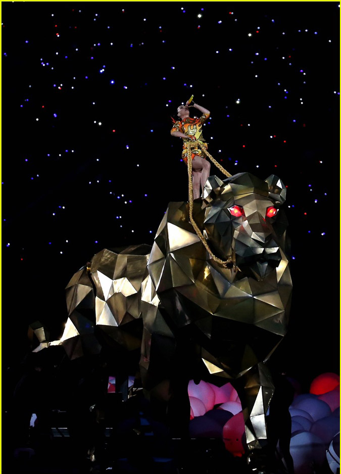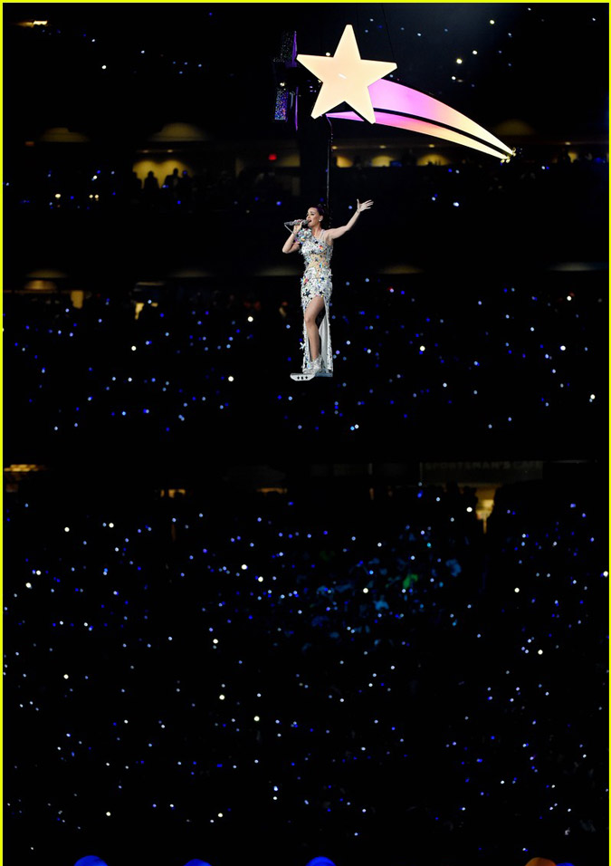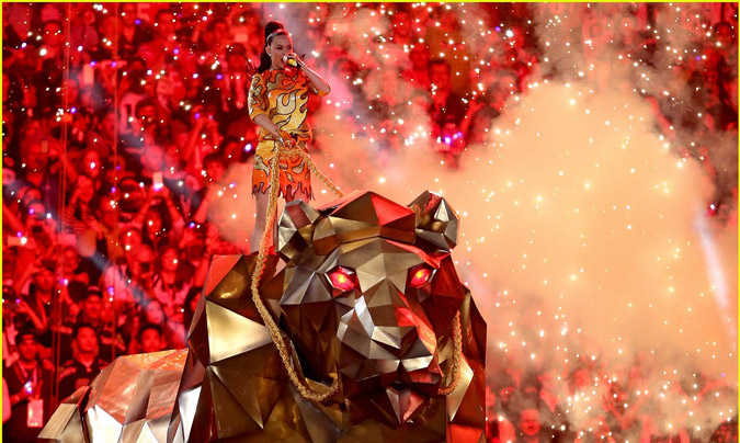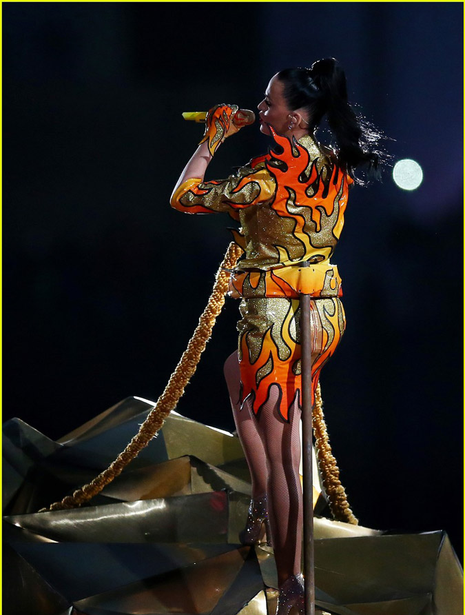 Με φωτιές και πυροτεχνήματα έκανε την εμφάνισή της στο Super Bowl η Katy Perry η οποία παρουσίασε ένα τριαντάλεπτο περίπου πρόγραμμα ερμηνεύοντας επί σκηνής τέσσερα τραγούδια.