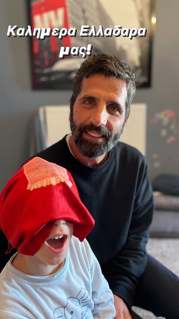 Στο πρώτο story που ανέβασε ο πρώην παίκτης του ριάλιτι, τον βλέπουμε μαζί με τον γιο του, με τον ηθοποιό να γράφει κάτω από την εικόνα «Καλημέρα Ελλαδάρα μας».