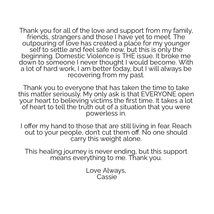 Με πολλή σκληρή δουλειά, είμαι καλύτερα σήμερα, αλλά πάντα θα ανακάμπτω από το παρελθόν μου. Σας ευχαριστώ όλους, όσοι βρήκατε το χρόνο να ασχοληθείτε σοβαρά με αυτό το θέμα. Το μόνο που ζητώ είναι να ανοίξουν ΟΛΟΙ την καρδιά τους για να πιστέψουν τα θύματα από την πρώτη φορά. Χρειάζεται να έχεις μεγάλη καρδιά για να πεις την αλήθεια από μια κατάσταση στην οποία ήσουν ανίσχυρος. Προσφέρω τη βοήθειά μου σε όσους εξακολουθούν να ζουν με το φόβο. Απευθυνθείτε στους ανθρώπους σας, μην τους αποκόψετε. Κανείς δεν πρέπει να κουβαλάει μόνος του αυτό το βάρος. Αυτό το ταξίδι θεραπείας δεν τελειώνει ποτέ, αλλά αυτή η υποστήριξη σημαίνει τα πάντα για μένα. Σας ευχαριστώ. Πάντα με αγάπη, Κάσι».