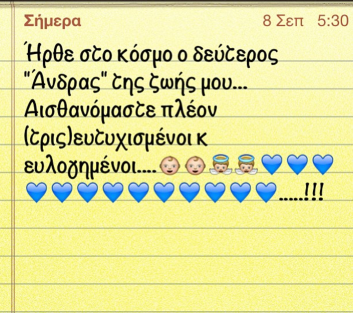 Την ευχάριστη είδηση επιβεβαίωσε και η Λεάννα Μαρκόγλου με ένα μήνυμα στον προσωπικό λογαριασμό της στο instagram. Το μήνυμα αυτό μάλιστα το ανάρτησε μέσα από το μαιευτήριο «ΡΕΑ» όπου ήρθε στον κόσμο ο γιος της.