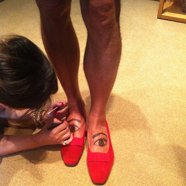 «Ανεβάζοντας» μια φωτογραφία με πόδια που φοράνε κόκκινα πάνινα παπούτσια και έχουν… ζωγραφισμένα μάτια στο coup de pied, αυτό που μας κάνει να σκεφτούμε ότι είναι τα πόδια του Λάκη και όχι γυναικεία είναι οι… τρίχες που διακρίνονται!