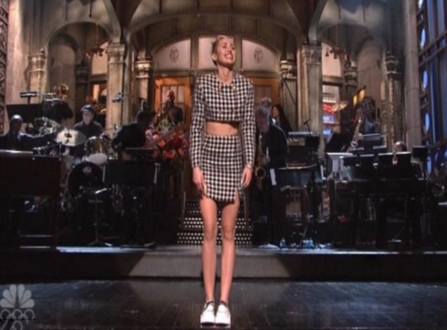 Μετά από το πρόστυχο σόου της στη σκηνή των MTV VMAs, μετά μια σειρά από γυμνές και προκλητικές φωτογραφήσεις και μετά από ένα αμφιλεγόμενο μουσικό βίντεο, όπου εμφανίζεται εντελώς γυμνή και γλείφει αλυσίδες, πλέον όλοι περιμένουν τα πάντα από την Miley, ακόμα και όταν είναι καλεσμένη στο SNL.