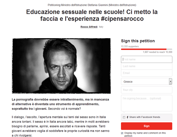 Σύμφωνα με ανάρτηση που πραγματοποίησε στην πλατφόρμα Change.org, όπου φιλοξενούνται καμπάνιες πολιτών, ο Σιφρέντι καλεί τον κόσμο να υπογράψει ώστε η σεξουαλική διαπαιδαγώγηση να αποτελεί μέρος του σχολικού προγράμματος των μαθητών στην Ιταλία.