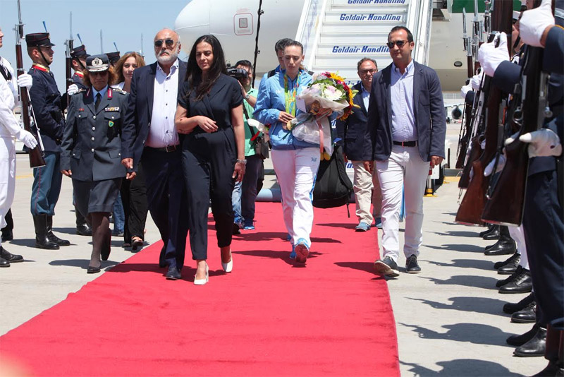 Στο «Ελευθέριος Βενιζέλος» υποδέχτηκε την Άννα Κορακάκη από την πλευρά της κυβέρνησης ο υπουργός Εσωτερικών κ. Παναγιώτης Κουρουμπλής ενώ προς τιμήν της στο αεροδρόμιο που παραταχθεί στρατιωτικό άγημα και είχε στρωθεί κόκκινο χαλί.