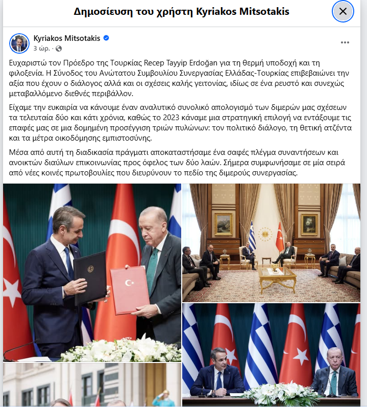 Σε ανάρτησή του αμέσως μετά ο Έλληνας πρωθυπουργός τόνισε με έμφαση ότι «η Σύνοδος του Ανώτατου Συμβουλίου Συνεργασίας Ελλάδας-Τουρκίας επιβεβαιώνει την αξία που έχουν ο διάλογος αλλά και οι σχέσεις καλής γειτονίας, ιδίως σε ένα ρευστό και συνεχώς μεταβαλλόμενο διεθνές περιβάλλον». Για τη συνάντησή του με τον Τούρκο πρόεδρο σημείωσε: «Κάναμε έναν αναλυτικό απολογισμό των διμερών μας σχέσεων τα τελευταία 2 και κάτι χρόνια, καθώς το 2023 κάναμε μια στρατηγική επιλογή να εντάξουμε τις επαφές μας σε μια δομημένη προσέγγιση 3 πυλώνων: τον πολιτικό διάλογο, τη θετική ατζέντα και τα μέτρα οικοδόμησης εμπιστοσύνης».