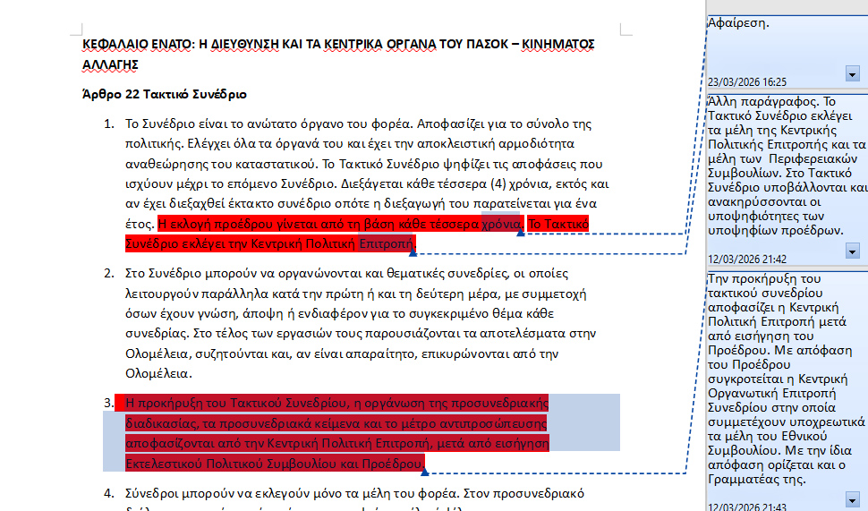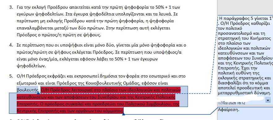 Έτσι, αφαιρείται η διατύπωση «Η εκλογή προέδρου γίνεται από τη βάση κάθε τέσσερα χρόνια. Το Τακτικό Συνέδριο εκλέγει την Κεντρική Πολιτική Επιτροπή» και προστίθεται η εξής: « Το Τακτικό Συνέδριο εκλέγει τα μέλη της Κεντρικής Πολιτικής Επιτροπής και τα μέλη των Περιφερειακών Συμβουλίων. Στο Τακτικό Συνέδριο υποβάλλονται και ανακηρύσσονται οι υποψηφιότητες των υποψηφίων προέδρων».