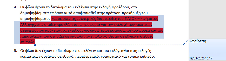 Απονευρώνονται οι αρμοδιότητες των φίλων του ΠΑΣΟΚ καθώς αφαιρείται η καταστατική παράγραφος που προέβλεπε ότι μετέχουν σε όλες τις εσωτερικές διαδικασίες του ΠΑΣΟΚ με ψηφοφορία. Έχουν απλώς δικαίωμα στην εκλογή προέδρου και στα δημοψηφίσματα.