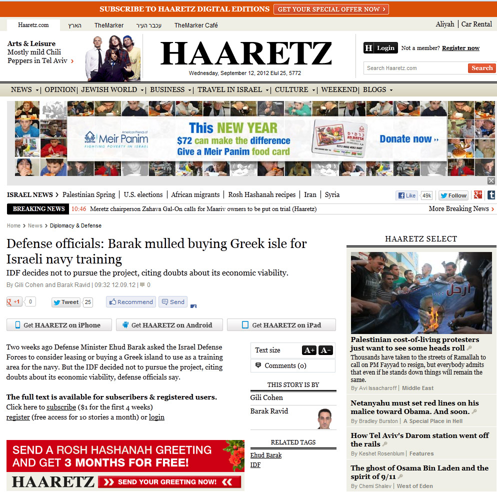 Δημοσίευμα της ισραηλινής εφημερίδας Haaretz αναφέρει ότι μετά τη δημοσίευση της συνέντευξης του Αντώνη Σαμαρά, ο Ισραηλινός υπουργός Άμυνας Εχούντ Μπαράκ ζήτησε από τους επιτελείς του να αναλύσουν το ενδεχόμενο αγοράς ενός ακατοίκητου ελληνικού νησιού προκειμένου να χρησιμοποιείται για τα γυμνάσια του ισραηλινού πολεμικού ναυτικού!