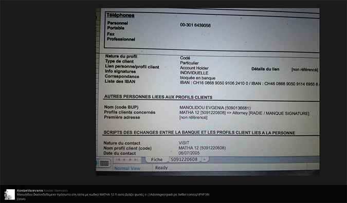 Το protothema.gr επικοινώνησε με την Ευγενία Μανωλίδου η οποία υποστήριξε ότι στη λίστα ήταν ο πρώην σύζυγός της. «Ήμουν το contact person σε περίπτωση θανάτου. Αυτό ίσχυε μέχρι την στιγμή που χωρίσαμε. Δεν ήμουν δικαιούχος λογαριασμού», μας είπε η κυρία Μανωλίδου.