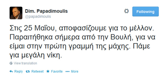 «Στις 25 Μαΐου, αποφασίζουμε για το μέλλον. Παραιτήθηκα σήμερα από την Βουλή, για να είμαι στην πρώτη γραμμή της μάχης. Πάμε για μεγάλη νίκη», ανέφερε χαρακτηριστικά στο Τwitter.