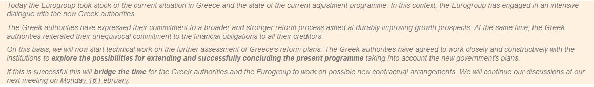 «Σήμερα το Eurogroup έκανε απολογισμό της τρέχουσας κατάστασης στην Ελλάδα και της κατάστασης του υπάρχοντος προγράμματος προσαρμογής. Στο πλαίσιο αυτό, το Eurogroup ενεπλάκη σε εντατικό διάλογο με τις νέες ελληνικές αρχές.