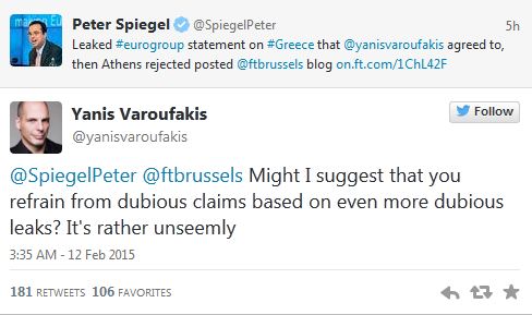 Το ίδιο παρασκήνιο μεταφέρει σήμερα και το περιοδικό Spiegel υπό τον τίτλο: «Η Ελλάδα σνομπάρει την Ευρώπη». Οπως αναφέρεται, ο γερμανός υπουργός Οικονομικών Βόλφγκανγκ Σόιμπλε αναχώρησε από το Eurogroup για το Βερολίνο πιστεύοντας ότι υπήρχε συμφωνία στο κοινό ανακοινωθέν. Αμέσως μετά όμως ο κ. Βαρουφάκης απέσυρε την έγκρισή του από το προσχέδιο το οποίο άφηνε να εννοηθεί ότι η Ελλάδα θα δεχόταν την παράταση του προγράμματος. Στο δημοσίευμα αναφέρεται επίσης ότι ο κ. Βαρουφάκης δεν έδωσε στους εταίρους κάτι γραπτώς αλλά μίλησε για πιθανές λύσεις.