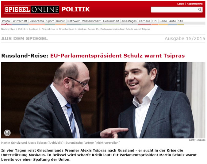 Πρώτο θέμα σήμερα στο γερμανικό περιοδικό Spiegel παίζει η αυστηρή προειδοποίηση του Γερμανού προέδρου του Ευρωπαϊκού Κοινοβουλίου Μάρτιν Σουλτς προς τον Αλέξη Τσίπρα σχετικά με το επικείμενο ταξίδι του πρωθυπουργού στη Μόσχα. Οπως αποκαλύπτει το περιοδικό, ήδη ο πρόεδρος του Ευρωκοινοβουλίου έχει χτυπήσει καμπανάκι για πιθανό ρήγμα στην Ευρωπαϊκή Ενωση.
