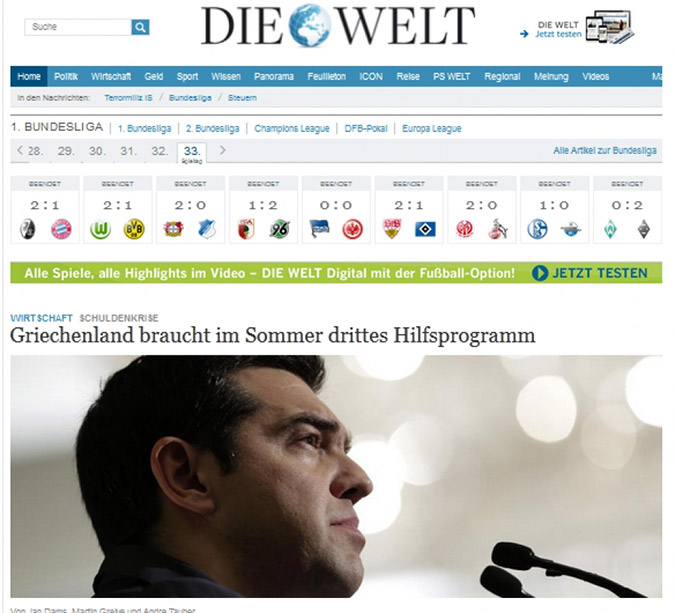 Όπως δηλώνουν στην Die Welt, ακόμη και αν η Ελλάδα πάρει τα 7,2 δισ. ευρώ της δόσης που εκκρεμεί από το καλοκαίρι του 2014, τα χρήματα θα εξαντληθούν το καλοκαίρι του 2015 και στη συνέχεια ο Αλέξης Τσίπρας θα αναγκαστεί να ζητήσει νέα βοήθεια, που θα υπόκειται σε νέους όρους.