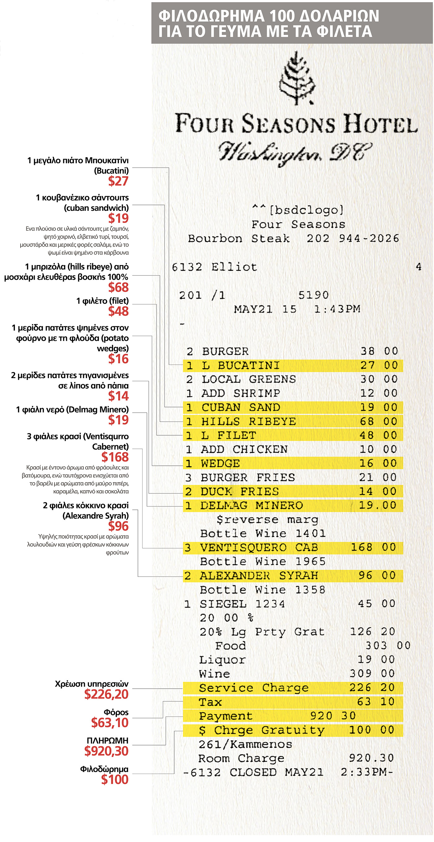 Ακριβά γαλλικά κρασιά, φιλέτα από μοσχάρι ελευθέρας βοσκής, ιταλικές σπεσιαλιτέ και ένα γενναίο φιλοδώρημα των 100 δολαρίων περιλάμβανε, μεταξύ άλλων, το λουκούλλειο γεύμα που πρόσφερε στο «Four Seasons» ο υπουργός Αμυνας σε συνεργάτες του.Πέμπτη, 21 Μαΐου, «Four Seasons», Ουάσινγκτον. Ωρα: 13.45. Οι εικόνες θυμίζουν άλλες εποχές. Ο υπουργός Αμυνας Παναγιώτης Καμμένος μαζί με τη σύζυγό του Ελενα Τζούλη κάθονται σε κεντρικό τραπέζι του φημισμένου «Bourbon Steak». Η κράτηση έχει γίνει από την προηγούμενη μέρα. Το εν λόγω εστιατόριο θεωρείται από τα must της πόλης, όπως αναφέρεται σε σχετικό αφιέρωμα της «Washington Post». «Δεν είναι καν ανάγκη να σου αρέσει το κρέας ώστε να είσαι θετικά προδιατεθειμένος να επισκεφτείς το μαγαζί που προσφέρει την καλύτερη μπριζόλα στην πόλη», γράφει ο συντάκτης της εφημερίδας Τομ Σιετσέμα αποθεώνοντας το «Bourbon Steak». «Οι αποχρώσεις του καφέ στον χώρο του εστιατορίου ενισχύουν την αίσθηση πως βρίσκεσαι σε ένα “Bourbon Steak” και φέρνουν αμέσως στο μυαλό τρυφερό βόειο κρέας με πατατάκια παρμεζάνας από το τοπικό κρεοπωλείο της Βιρτζίνια. Ενας ακόμη λόγος που το εστιατόριο κάνει τη διαφορά και σκαρφαλώνει στην κορυφή», προσθέτει.
