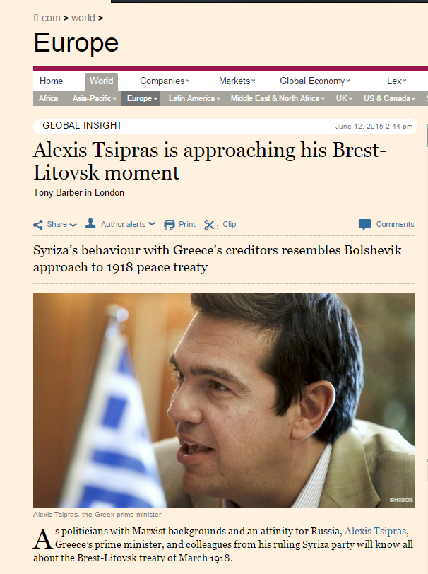 Ως πολιτικοί με μαρξιστικό υπόβαθρο και μια... συγγένεια με τη Ρωσία, ο Αλέξης Τσίπρας, ο Έλληνας πρωθυπουργός, και οι συνεργάτες του στην κυβέρνηση του ΣΥΡΙΖΑ γνωρίζουν τα πάντα για τη συνθήκη του Μπρεστ-Λιτόφσκ το Μάρτιο του 1918. Ή ας ελπίσουμε ότι το κάνουν, αναφέρει σημερινό δημοσίευμα των Financial Times που επιθυμεί να κάνει έναν παραλληλισμό του χθες με το σήμερα.