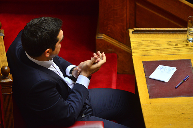 Δεκατέσσερις λέξεις στο χαρτί που είχε μπροστά του στο έδρανο του πρωθυπουργού έγραψε ο Αλέξης Τσίπρας στο ξεκίνημα της συζήτησης για τη λήψη απόφασης επί της πρότασης του υπουργικού συμβουλίου να διεξαχθεί δημοψήφισμα προκειμένου ο λαός να αποφασίσει αν αποδέχεται ή όχι την πρόταση των δανειστών.