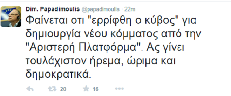 Ένα βήμα πριν από τη δημιουργία νέου κόμματος φαίνεται πως είναι η Αριστερή Πλατφόρμα, σύμφωνα με τον Δημήτρη Παπαδημούλη ο οποίος με ανάρτησή του στο Twitter το πρωί του Σαββάτου αναφέρθηκε στις πληροφορίες που κυκλοφορούν και θέλουν τον Παναγιώτη Λαφαζάνη να συνεχίζει εκτός ΣΥΡΙΖΑ και με άλλο κόμμα.