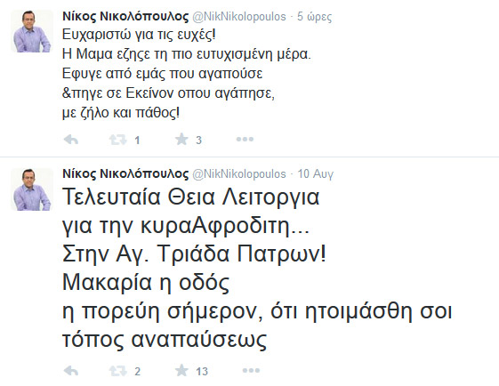 Πένθος βαρύ για τον βουλευτή των Ανεξάρτητων Ελλήνων, Νίκο Νικολόπουλο, ο οποίος οδήγησε τη Δευτέρα τη μητέρα του στον τελευταίο τόπο κατοικίας της.