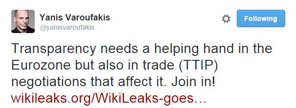 Την συνεισφορά μας στην προσπάθεια των WikiLeaks ώστε να αποκαλυφθεί η συμφωνία εμπορίου μεταξύ ΗΠΑ και ΕΕ, ζητά ο Γιάνης Βαρουφάκης, ένας από τους υπέρμαχους της κίνησης.