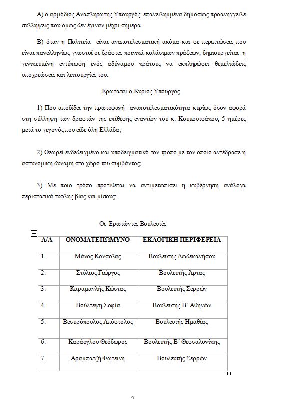 1) Που αποδίδει την πρωτοφανή αναποτελεσματικότητα κυρίως όσον αφορά στη σύλληψη των δραστών της επίθεσης εναντίον του κ. Κουμουτσάκου, 5 ημέρες μετά το γεγονός που είδε όλη Ελλάδα;