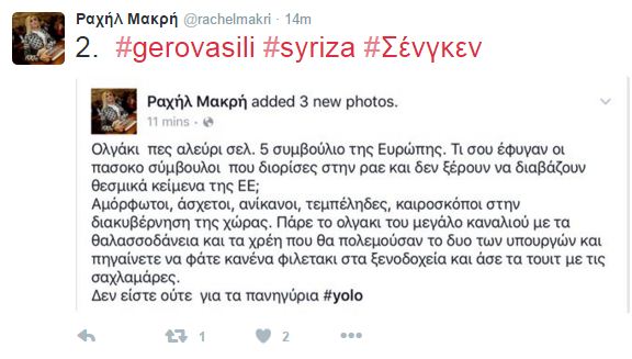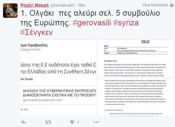 Με μήνυμα της στο Twitter, η κυρία Μακρή σχολίασε τις δηλώσεις της κυβερνητικής εκπροσώπου σχετικά με τις ευρωπαϊκές πιέσεις για τη Συνθήκη Σένγκεν και «στόλισε» κανονικά την κυρία Όλγα Γεροβασίλη.